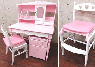 カリモクとメゾピアノのコラボデスク、S332を買取りさせて頂きました。買取させて頂きましたS332 デスクセットは、女の子が喜ぶ、とても可愛らしいデザインです。メゾピアノも人気子供服ブランドで、色味だけじゃなくて細部に至るまで可愛さやメルヘンチックな雰囲気を追求しています。学習もしやすいように引き出しや本棚、配線用の穴など、機能面も充実しています。セットのワゴンには鍵が付いているので、大切なものをしまうときにも安心です。