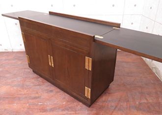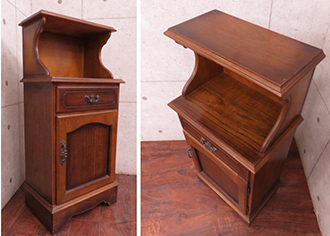 カリモクのクラシカルなサイドキャビネット/電話台を買取いたしました。買取いたしましたQC1502はオールドカリモクの製品で、短い期間限定でしか作られていなかったので希少価値があります。デザインもアンティークテイストで、使い方次第でどこでも活躍します。木製家具を長年作ってきたカリモクの家具なので耐久性も強度も信頼できる作品です。クラシックな空間にも、和風の空間にもマッチするサイドキャビネットです。